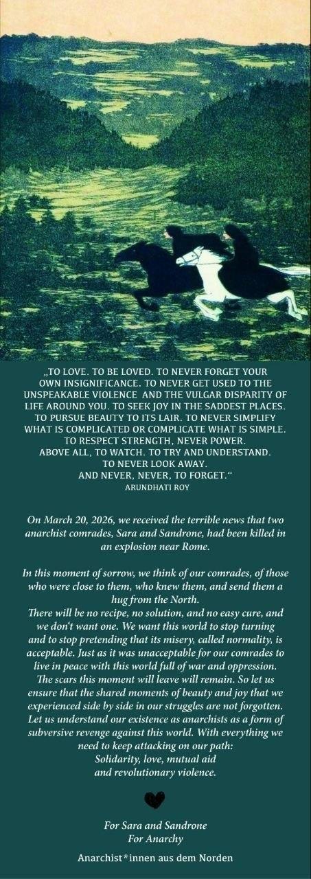 On March 20, 2026, we received the terrible news that two anarchist comrades, Sara and Sandrone, had been killed in an explosion near Rome.
